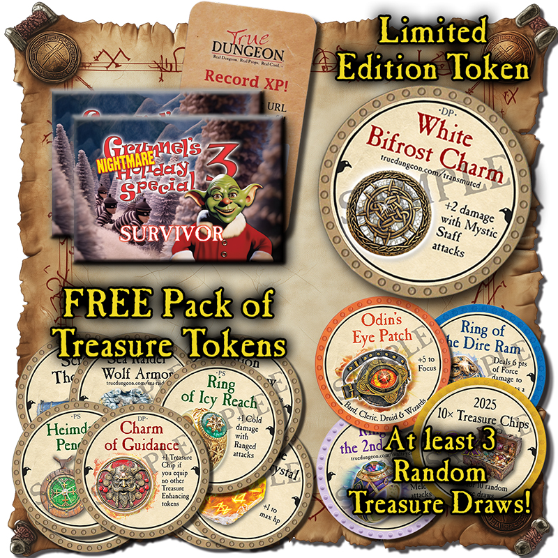 Now is your chance to experience an incredible at-home virtual D&D adventure complete with virtual dice rolling, equip-able virtual gear, live camera feeds of amazing sets and a friendly DM. After the event, we will ship you awesome swag such as a Survivor Button, Treasure Token pack, Treasure and Participation tokens, and you will even get an XP code to give yourself some Experience Points to earn cool stuff. Grunnel's Holiday Special Part 3 will earn you the final piece you need to transmute all the 2025 Participation tokens into the limited-edition Relic-level token "Bifrost Charm".