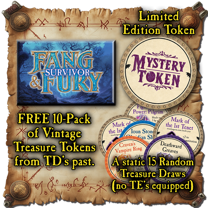 This sealed-pack, gothic-themed adventure, follows the events of The Sacred Circle and The Sacred Path adventures at Ring Con. This event has the same full quality of a traditional TD adventure, but it will concentrate the fun in four rooms (rather than seven). You will enjoy amazing sets, fearsome monsters, fun team puzzles and friendly NPCs. Players get a free bag of 10 Treasure Tokens ($10 value), fifteen (15) fixed random treasure draws (no TEs can be equipped), and a limited-edition Participation token. "Survivor" buttons for those who triumph. While you may trade the 10 provided tokens with other players in your group, you cannot use other previously acquired treasure tokens. You must physically present a Ring of the Sacred Circle token when entering this event.