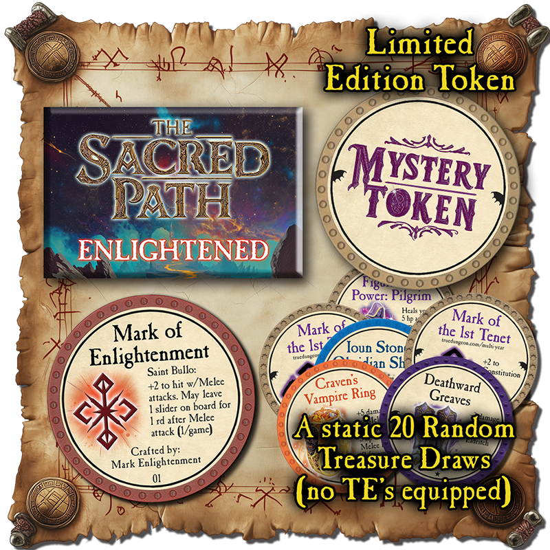 This exclusive-to-Ring Con 7-room adventure that is a sequel to the "The Sacred Path" adventure. You will enjoy strangely immersive sets, bizzare monsters, twisted team puzzles, and engaging NPCs. Players get a free bag of 10 Treasure Tokens ($10 value), three random treasure draws (4 draws if 6th level) and a limited-edition Participation token. "Enlightened" buttons for those who survive the path. You must physically present a Ring of the Sacred Circle token when entering this event.